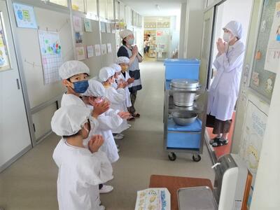 【1年生】1枚目の写真は、給食当番の子どもたちが、配膳室に行き自分のクラスの給食ワゴンを取りに来た時の写真です。入学してまもなく2ヶ月、学校生活にもすっかりと慣れて楽しく生活しています。
