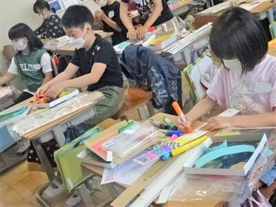 【4年生】1枚目の写真は、図工の「コロコロガーレ」の活動をしている様子です。ビー玉をころがす楽しいコースを作るのですが、子どもたちは工夫いっぱいです。「隠し扉もあるんです」と工夫を説明してくれました。