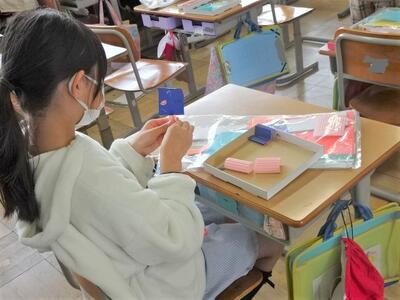 今日は、3年生の図画工作「カラフルフレンド」です。この単元では、いろいろな色の紙や形の組み合わせを工夫して、楽しい友だちを作る内容です。カラフルな色紙をビニールの中に入れ、バランスをとりながら形作っていきます。子どもたちの愛情たっぷりの人形の友だちがでいあがりました。