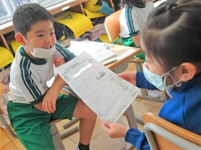 【1年生】1枚目と2枚目の写真は、国語の学習の様子です。「ききたいな、ともだちのはなし」という教材の学習で、これまでに調べてきた友だちのことを、紹介し合う活動をしています。1枚目のように紹介の仕方について全員の前で手本を見せた後、2枚目のように隣や近くの友だちに、自分が調べた友だちのことを紹介し合いました。
