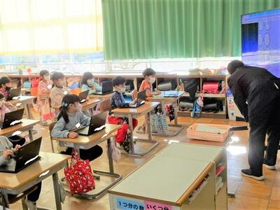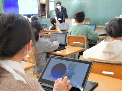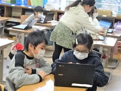 【2年生】今日は、どのクラスも1時間ずつ「プログラミング」を学習する時間をとりました。今日は、自分が描いた魚の絵を画面上に泳がせるというプログラミングです。口をパクパクさせる動きの設定の仕方も教わり、自分が思い描いたように画面上の魚を動かすプログラムを組むことができました。