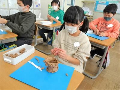 【2年生】1枚目の写真は、図画工作の時間の一コマです。いよいよこの後は版画の学習に入りますが、その前に自分が表したい顔の表情を粘土で作成してみました。粘土を顔の形にするのにも、けっこうな力や工夫が入ります。子どもたちは、大きさと、顔のバランスを考えながら顔の表情を表すことができました。