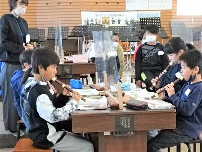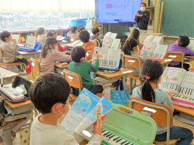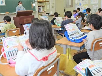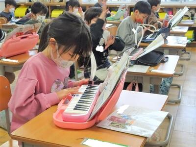 【1年生】1年生の教室から鍵盤ハーモニカの音が聞こえています。新型コロナウイルス感染症に気をつけながら、実際に音を出して自分の音を確かめています。1~3枚目の写真は、音楽の時間の様子です。「どれみのおとであそぼう」というめあてで、「あのね」という教材を使って演奏をしていました。指の動かし方の練習をたくさんしてきたので、音を出してもスムーズです。