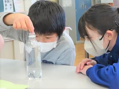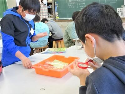 【5年生】1枚目と2枚目の写真は、理科の時間の写真です。いよいよ「もののとけ方」という単元の学習に入りました。今日は、食塩などが水に溶ける様子を観察しました。1枚目の写真では、食塩(結晶)を直に虫眼鏡で観察しいます。2枚目の写真は、水を入れたペットボトルに食塩を入れ、その溶け方をじっくりと観察しています。