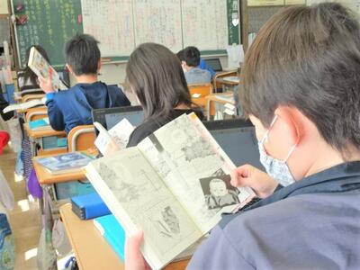 【6年生】1枚目の写真は、国語の時間に狂言の「柿山伏」を視聴している様子です。「伝統文化を楽しもう」という題材の学習です。静かな教室の中で、一人一人がタブレットPCとイヤホンを活用して、狂言の世界に浸っていました。
