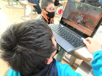 【2年生】今日はどのクラスも「プログラミング」の学習がありました。冬休み前に行ったプログラムを、さらに複雑な命令をだせるようにパワーアップした内容です。自分が考えたモンスターを、モンスターボールを使って捕まえるというプログラムです。スムーズに動くためにはどうしたらよいかを考えながら、プログラムの順番を考えていました。
