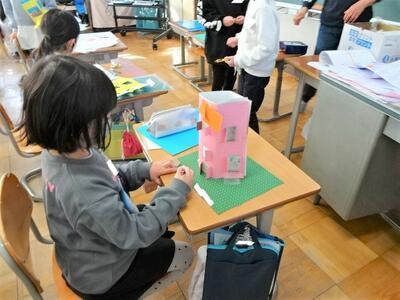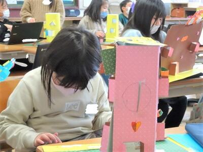 【5年生】5年生の図画工作が新しい単元の活動に入りました。「ミラクル!ミラーステージ」という題材の活動です。ここでは、鏡のもつ面白さや不思議さを活かして、映り方や見え方を試しながら、形や色などの造形的な特徴を捉え立体の作品に表していきます。今日は、土台を作ったり、さっそく制作を始めたりしました。