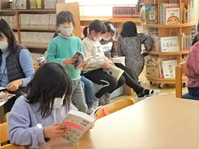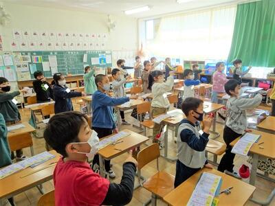 【1年生】1枚目の写真は、国語の時間の様子です。新しい単元の学習「すきなところをみつけよう」の学習に入りました。「たぬきの糸車」という教材を使っての学習です。1年生にとってはちょっと長い物語ですが、さっそく範読を聞いた後、先生の範読にあわせて音読する学習を行っていました。