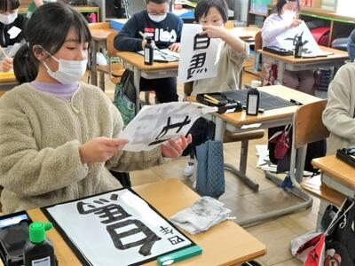 【6年生】1枚目の写真は、書写の時間の様子です。6年生の書写も、いよいよまとめの学習に入ってきました。今日は、これまでに学習したことを振り替えり、学習してきた知識や技能を確かめたあと、「感謝」という言葉を毛筆で練習しました。書き初めも兼ねた単元です。思いを込めて書いてほしいと思います。