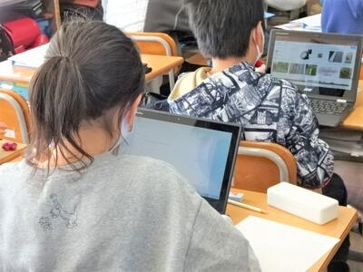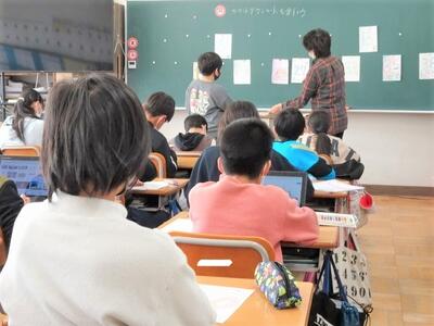 【4年生】1枚目の写真は、国語の時間の一コマです。「自分だけの詩集を作ろう」という題材の学習です。今日は、自分が決めたテーマと「共通点」のある詩を見付けていく作業をしていました。今はインターネットの中にたくさんの詩があります。大量の情報の中から、自分の詩集にふさわしいものを一生懸命探していました。