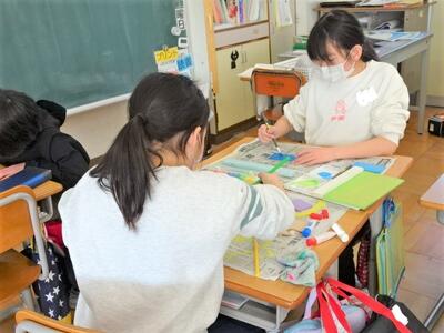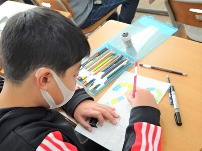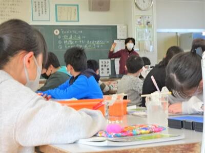 【4年生】1枚目の写真は、国語の時間の「自分だけの詩集を作ろう」という題材の学習です。この学習も、いよいよ大詰めです。自分が気に入った詩をワークシートに書き入れてきて、結構な数の詩ができあがっています。今日は、先生から表紙の紙が配られました。最後の詩集作りを急ピッチで仕上げていました。