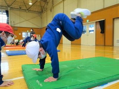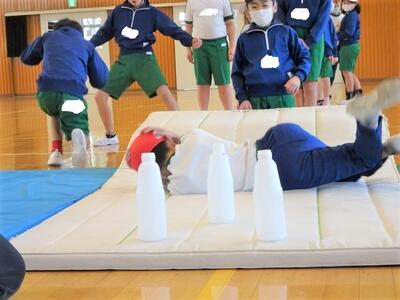 【2年生】1枚目の写真は、体育の時間の様子です。「マットを使った運動遊び」の単元の活動です。今日は、横転がりができることを目指して、ボーリングのピンに見立てたボトルを、横転がりをしていって倒す遊びです。まっすぐに横転がりしないとボトルは倒れません。簡単そうにみえますが、途中で曲がってしまったり、止まってしまったりする場面も見られました。