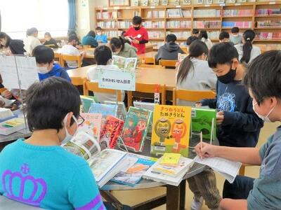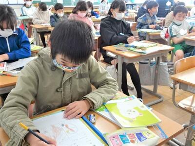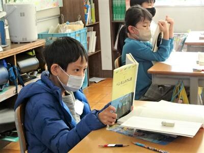 【3年生】1枚目と2枚目の写真は、国語の「たから島のぼうけん」という教材の学習の一コマです。1枚目の写真では、実際に物語を書き始める前に、宝島の地図を見ながらどんなところがあり、どんな動物が住んでいるか確認しています。2枚目の写真は、物語を実際に書いている様子です。すでに4枚目、5枚目に突入した子どもたちもいました。