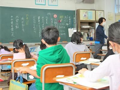 【3年生】1枚目の写真は、国語の「たから島のぼうけん」という教材の学習の一コマです。ちょうど指を指しているのが「たから島」の地図です。この単元では、この地図を舞台にした冒険物語を書くことを目的にしています。自分で登場人物を考え、宝の隠し場所や名所を設定して、一人一人の物語を描き始めました。どんな物語ができあがるのか楽しみです。
