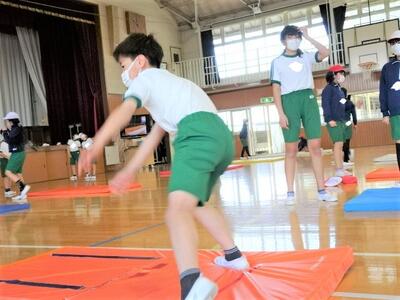 【1年生】今日は3クラスとも体育の時間がありました。「跳び箱を使った運動遊び」の活動です。これまで、跳び箱を使って「跳び越し跳び」や「またぎ下り」などを行ってきましたが、今日は2段から3段の跳び箱に挑戦しました。難しさに応じて4つの場を作り、自分ができるところを選択してチャレンジしました。