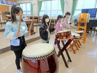 【2年生】1枚目の写真は、音楽の時間の一コマです。「おまつりの音楽」という題材の学習で、「村まつり」の曲に合わせて5種類の太鼓をたたいていきます。全員がすべての太鼓を体験することができるように、1フレーズが終わると場所を移動していました。太鼓による音の違いを体験しながら演奏することができました。