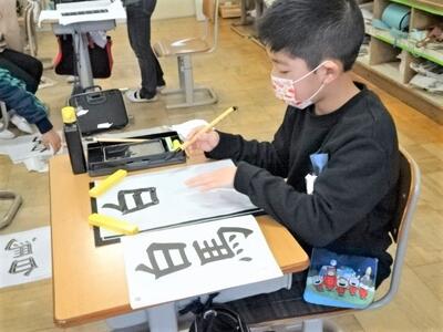 【4年生】1枚目の写真は、国語(書写)の時間の様子です。「白馬」と書いていますね。今日の学習は、「漢字どうしの大きさ」について学習しています。漢字を並べて書くときは、画数が少ない漢字や周りが線で囲まれている漢字を小さめに書くと読みやすくなります。子どもたちは、「白」を少し小さめに書くことを意識しながら、バランスの良い字を書いていました。