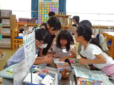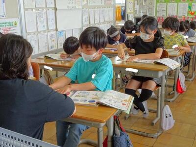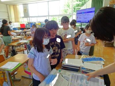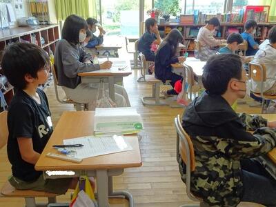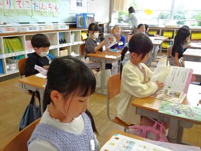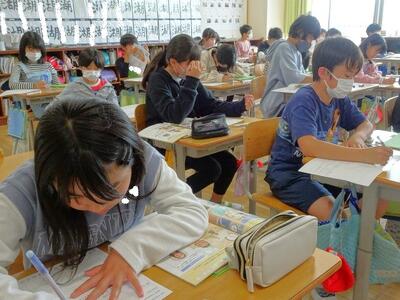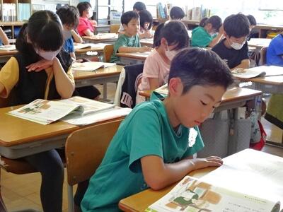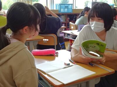 【2年生】1枚目の写真は、図書室で本を借りている様子です。来週のすきま読書に備えて、違う本に挑戦します。