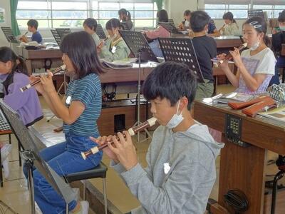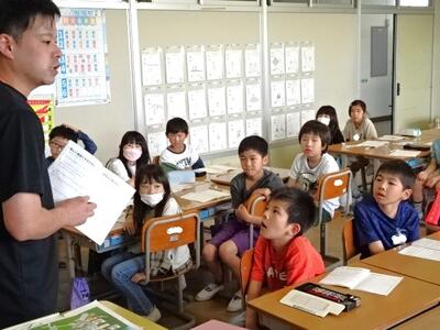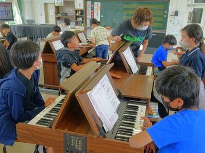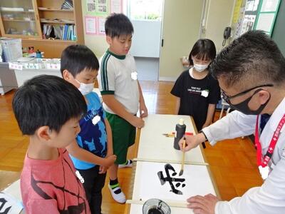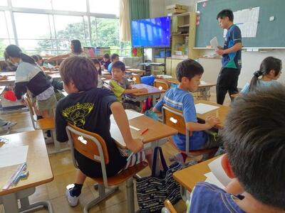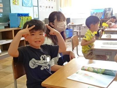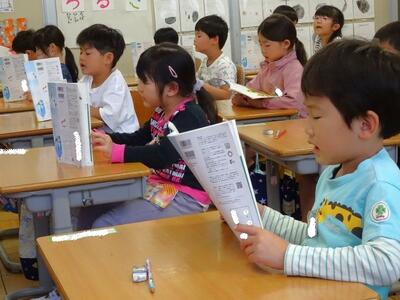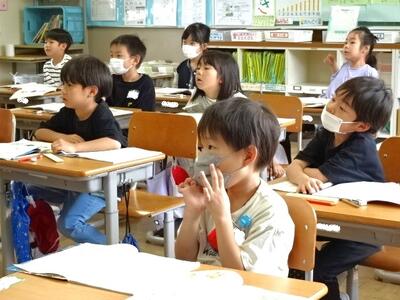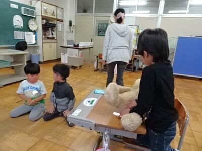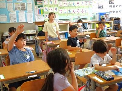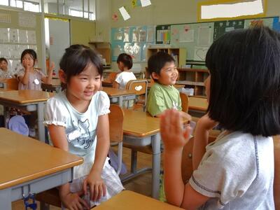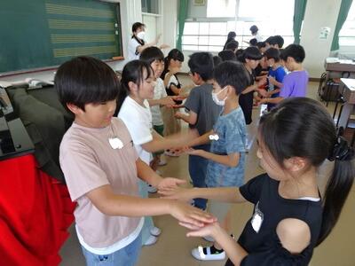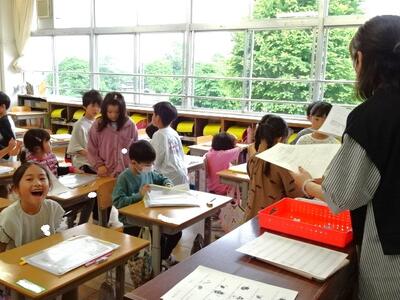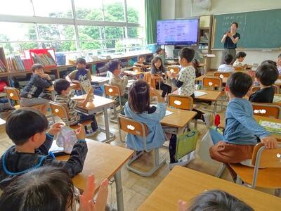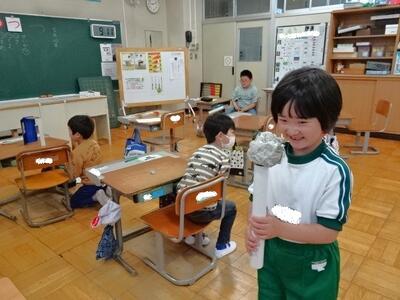 【1年生】1枚目の写真は、音楽の「はくをかんじとろう」の学習の様子です。「じゃんけんぽん」の音楽に合わせてリズムをとり、最後にじゃんけんをします。全員と校長先生でじゃんけんをしている場面です。