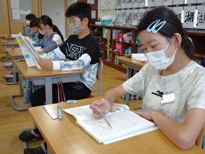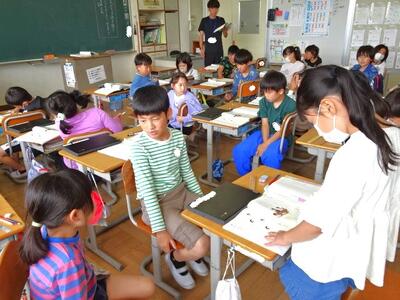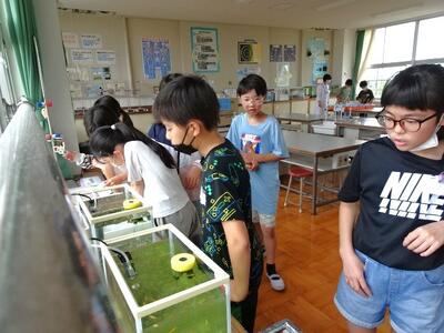 【5年生】1枚目の写真は、授業中の写真ではありません。休み時間の理科室の様子です。理科の学習で育てているメダカやインゲンの世話や観察にしっかりと励んでいます。