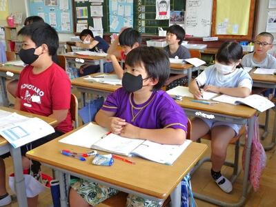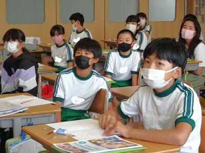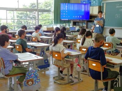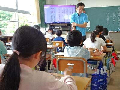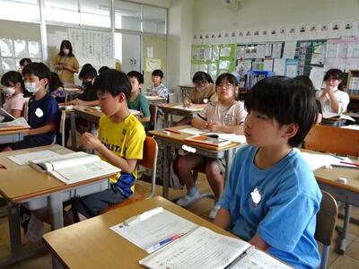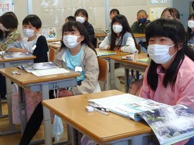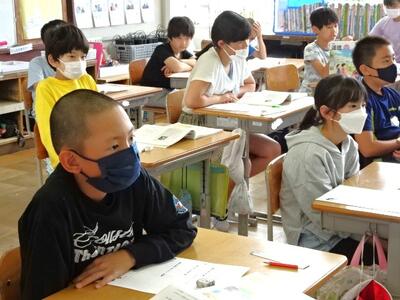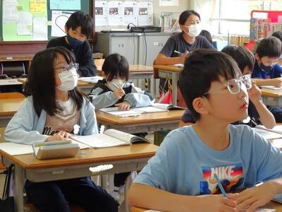 【4・5・6・7組】大型提示装置に学習の映像を流しています。集中しています。