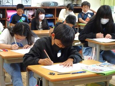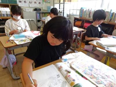 【4年生】1枚目の写真は、図画工作の「コロコロがーれ」の学習の様子です。今日は、設計図作りです。教科書のイメージから、自分で作りたい物を考えています。