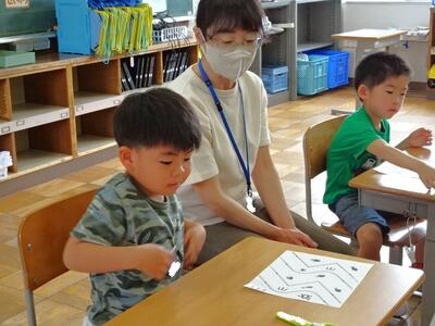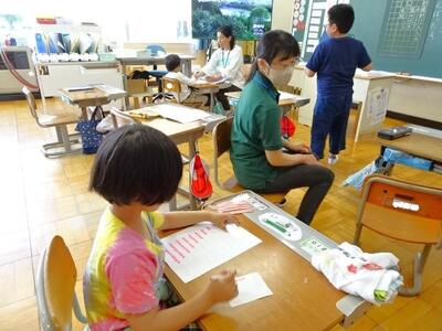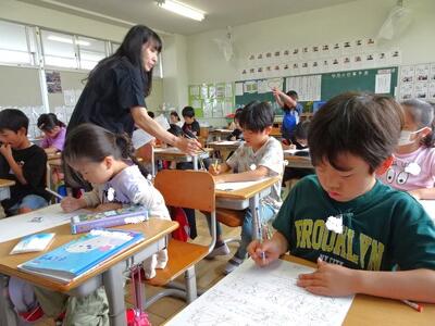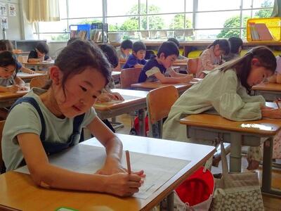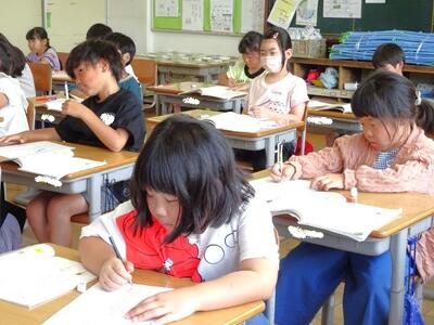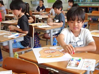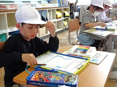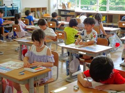 【1年生】1枚目の写真は、図画工作の時間に遠足の思い出を描いている様子です。動物とふれあっていたり、乗り物に乗っている様子を楽しく表現していました。