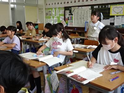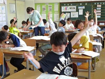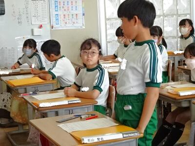 【3年生】1枚目の写真は、外国語活動の時間の様子です。今日は、いろいろな国の「じゃんけん」の掛け声を学習しました。韓国や中国のじゃんけんの掛け声を確認しながら、じゃんけんに挑戦しました。