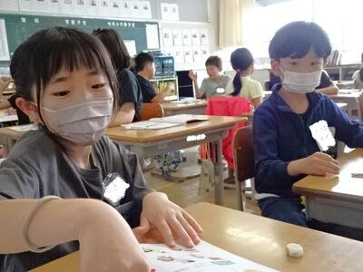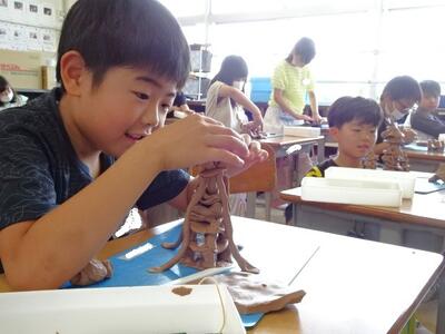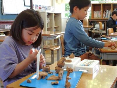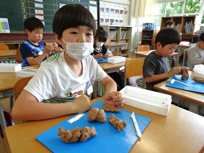 【2年生】1枚目の写真は、図画工作科の学習の様子です。粘土を使って、楽しい作品をたくさん作りました。