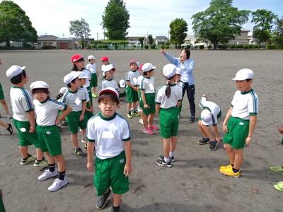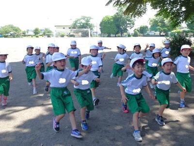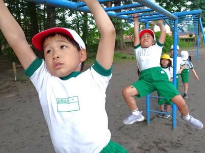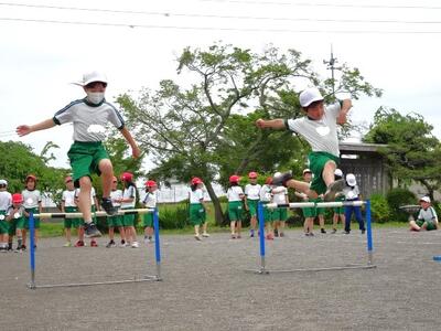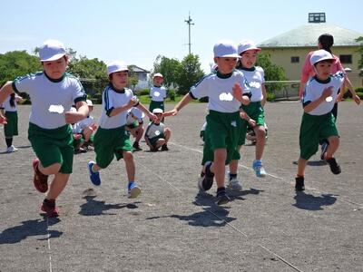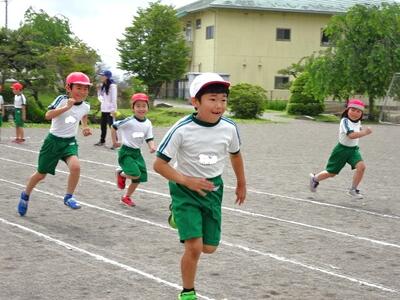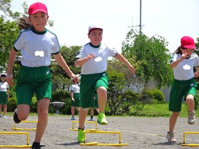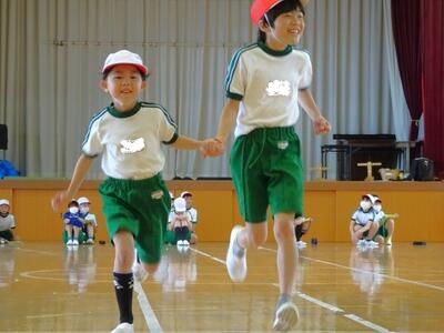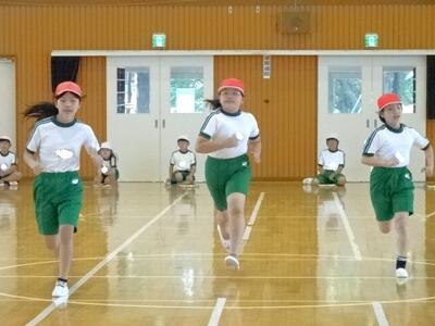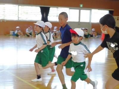 【1年生】1枚目の写真は、新体力テストの「シャトルラン」の練習をしている様子です。1年生は、5年生がお手伝いをしてくれています。一緒に走る微笑ましい光景です。