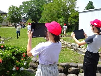 【6年生】1枚目の写真は、図画工作の「わたしの大切な風景」の学習の様子です。今日は、外に出て、大切な風景をタブレットの画像に収めました。