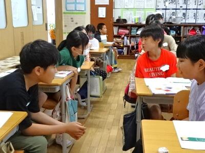 【2年生】1枚目の写真は、国語の「スイミー」の学習の様子です。物語も佳境です。大きな黒い魚が現れました。小さな魚たちは、どうにかしないといけません。みんなで協力する話し合いをします。