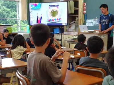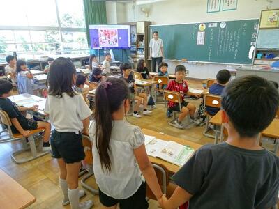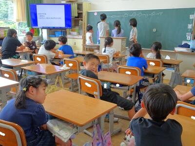 【4・5・6・7組】1枚目の写真は、国語の学習の様子です。「スイミー」の実際の世界のイメージをつかむために、大型提示装置で海の中の様子を観察しています。