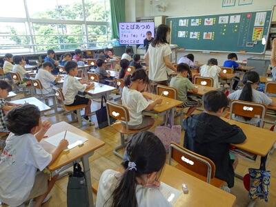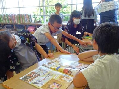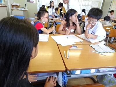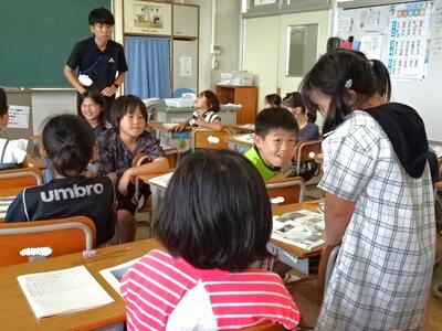 【6年生】1枚目と2枚目の写真は、外国語の「Welcome to Japon」の学習の様子です。今日は、いろいろな国の特徴を知らせるために、どんなスピーチをしたらよいか、告別のカードを使って紹介し合っていました。
