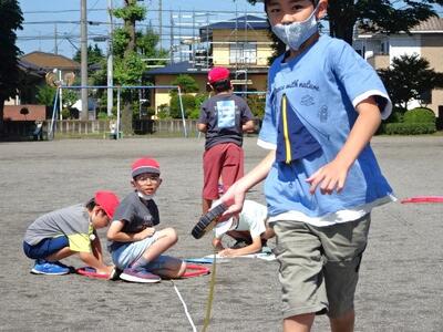 【3年生】1枚目の写真は、算数の「長い長さをはかってあらわそう」の学習の様子です。校庭で、10mはどのくらいの長さか予想をして、巻き尺で実際にはかって10mの長さを体感しました。