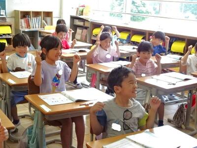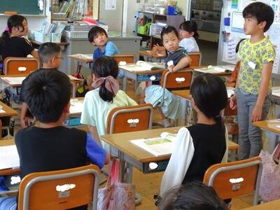 【1年生】1枚目の写真は、生活科の「がっこう だいすき」の学習の様子です。今日は、学校探検をするにあたって、担当の先生に聞きたいことについて話し合いました。