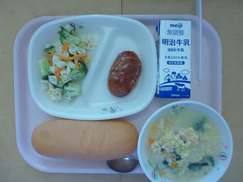 今日はお話しランチメニューです。絵本「パンしろくま」からコッペパンです。くいしんぼうなしろくまの家族がイチゴジャムと一緒にコッペパンに挟まっています。