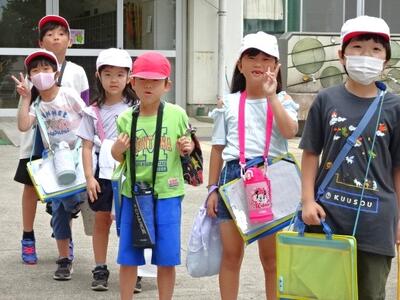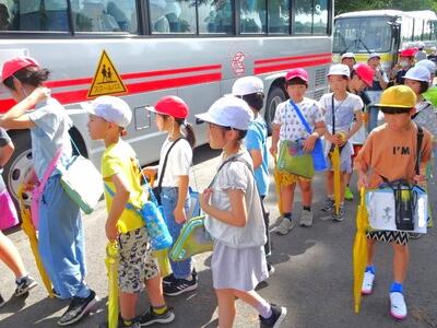【1年生】今日は、1年生が待ちに待った校外学習です。生活科の「みんなのこうえんであそぼう」の学習で、「ゆうゆうパーク」に行ってきます。元気いっぱいで出発しました。活動の様子は、後日お伝えしますね。