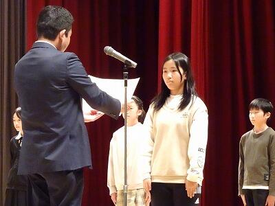 昼休みにオンラインによる表彰集会を行いました。絵画・ポスターや感想文、書写書道、体力テストなど様々な分野で、多くの児童ががんばっています。今日は代表して7名の児童が賞状を受け取りました。これからも、いろいろなことに意欲的に挑戦して、好きなこと得意なことを伸ばしていってほしいと思います。