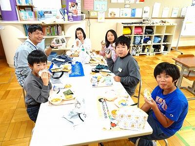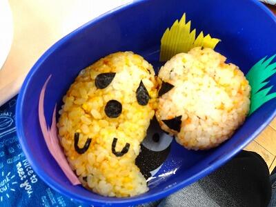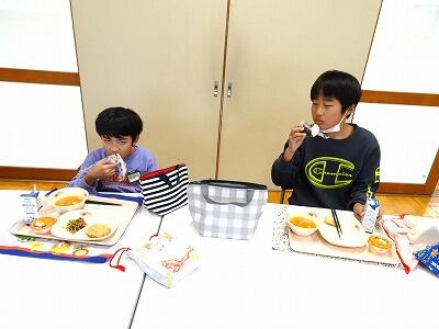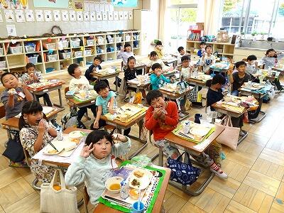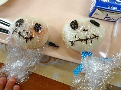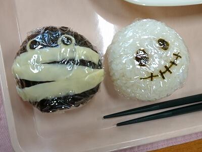 今日は、「おにぎりの日」献立でした。「牛乳、とり肉の竜田揚げ、ツナ海苔酢和え、大根と豆腐のみそ汁、ハロウィンデザート」に、お家から持ってきてもらった「おにぎり」が今日のメニューです。どれもとてもおいしかったのですが、子どもたちは、お家の方に作ってもらったり、自分で作ったりしたおにぎりを一番おいしそうに食べていました。