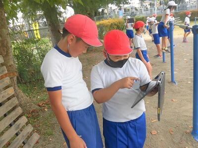 1年生が校庭東側の樹木の方へ歩いて行きます。探検バックを肩から下げており、やる気満々です。生活科の学習で虫探しをするのです。ワークシートには、8種類の虫を書き入れるスペースがあります。赤とんぼやバッタ、カマキリなど、たくさんの種類を見付けて大興奮でした。
