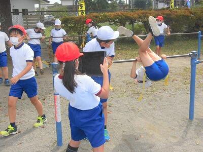 体育でリレーを学習していたこのクラスでは、以前に撮影した自分たちのリレーの様子の動画を見直して、バトンパスのこつを話し合っていたのです。その後、実際に走ってパスの仕方などを確かめました。そしてさらにグループで自分たちの走り方やバトンパスの仕方を振り返り、「次はこうしよう」と話し合いました。自分たちで話し合い、考えながら運動する。思考力を育む体育の授業だなと感じました。