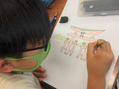 1年生の算数の授業におじゃましました。1年生は今、箱の形の学習をしています。今日は、箱の形を紙に写して、その形から想像して絵にしていくという活動でした。円い筒をタイヤに見立てて車を描いたり、四角い形を窓に見立てて部屋の中を描いたりと、想像を膨らませていました。