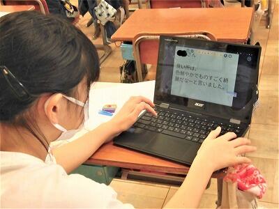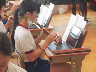 誰も居ないはずの教室からリコーダーの音が聞こえます。不思議に思いのぞいてみると、4年生が一人でクロムブックに向かってリコーダーをふいています。新型コロナウイルス感染症への対応で、これまで行ってきた通常の座り方でのリコーダーや歌は行わないことにしています。部屋に一人か二人の少人数で、向きを考慮すれば演奏は可能です。よくみると、クロムブックに自分の笛の演奏の動画を撮影しています。終わると、それを先生のパソコンに提出(送信)していました。音楽室をのぞくと、「ハローサミングをふこう」とめあてが記されています。音楽室では楽譜を写す作業をしていました。コロナ前は、よくリコーダーのテストとかをやっていました。動画であれば指の動きや息継ぎ、音があく分かります。クロムブックの使い方の幅がどんどん広がります。