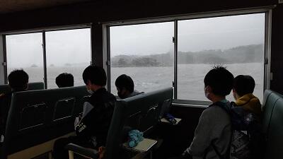 あいにくの荒天ですが、遊覧船会社のご厚意で、 揺れが少ない大型船を用意してくださいました。貸し切りの船は、 波の少ないコースを進んで行きます。遠くまでは見えませんが、 子どもたちは、島の説明を聞きながら、島影を見ていました。