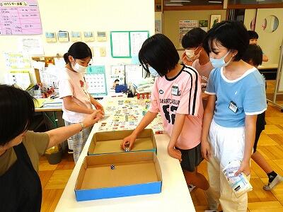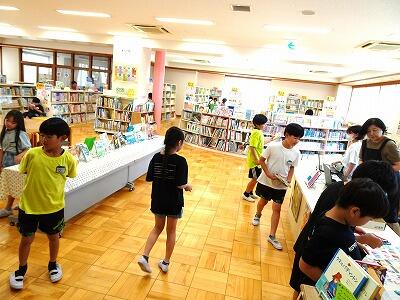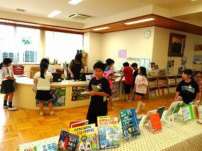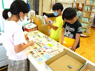 今日の昼休みは非常に暑くなったので、室内で過ごしました。今、図書室では、本を借りてサイコロを振り、同じ目が出るとしおりや一冊多く借りられる券がもらえるイベントをしています。業間休みにもたくさんの児童が図書室を訪れましたが、昼休みにも多くの児童が本を借りに来ていました。