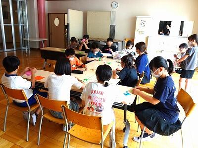 1年生の図画工作「やぶいたかたちから うまれたよ」の授業のようすです。破いたりちぎったりした形から面白さを見いだし、組み合わせるなどして想像を広げ、自分の思いを楽しく表現していました。