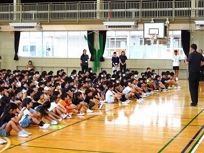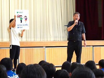 本日、不審者が校舎内に侵入したことを想定した避難訓練を実施しました。教室から避難したり、教室内にバリケードをつくって籠もったりと、不審者の侵入状況に応じてより安全な方法で身を守る練習をしました。体育館では、スクールサポーターの方より不審者から身を守る方法や「いかのおすし」について話をしていただきました。みんな真剣に訓練に取り組んでいました。あと1か月ほどで夏休みになります。ご家庭でも安全な過ごし方について話し合っていただければと思います。