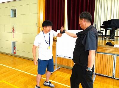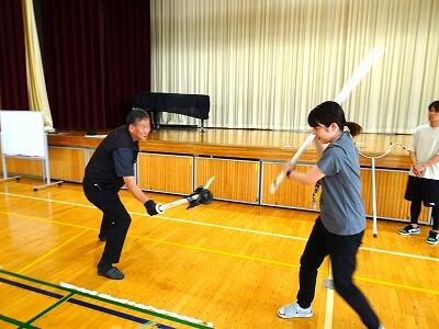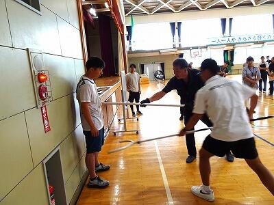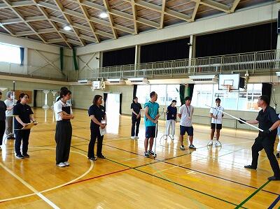 避難訓練終了後、教職員は不審者への対処法や「さすまた」の使い方について講習を受けました。
