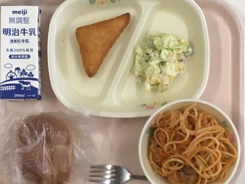 ミニこめこパン 牛乳 ツナとトマトのスパゲティ チーズはんぺんフライ かんぴょうサラダ